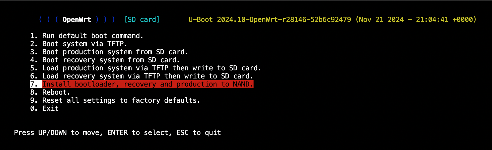 Return to the menu and turn off the router. Change the boot jumper to boot from NAND.