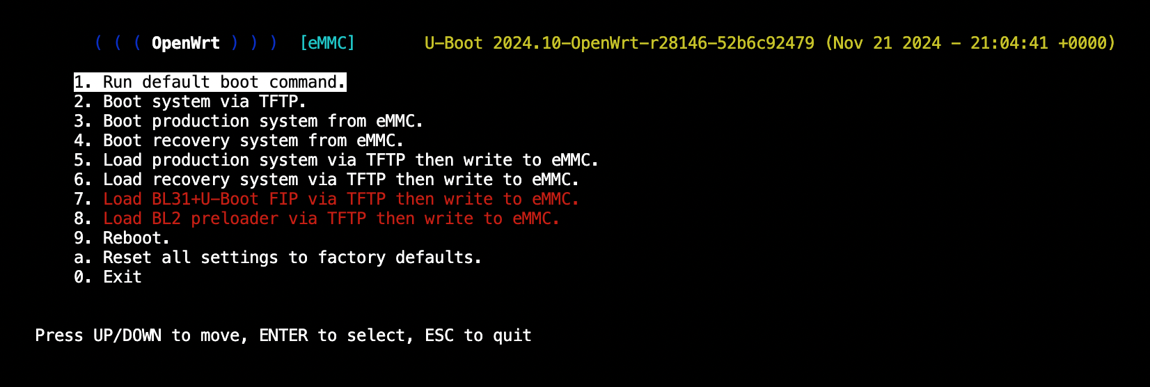 Turn on the router. The boot menu should now display eMMC.